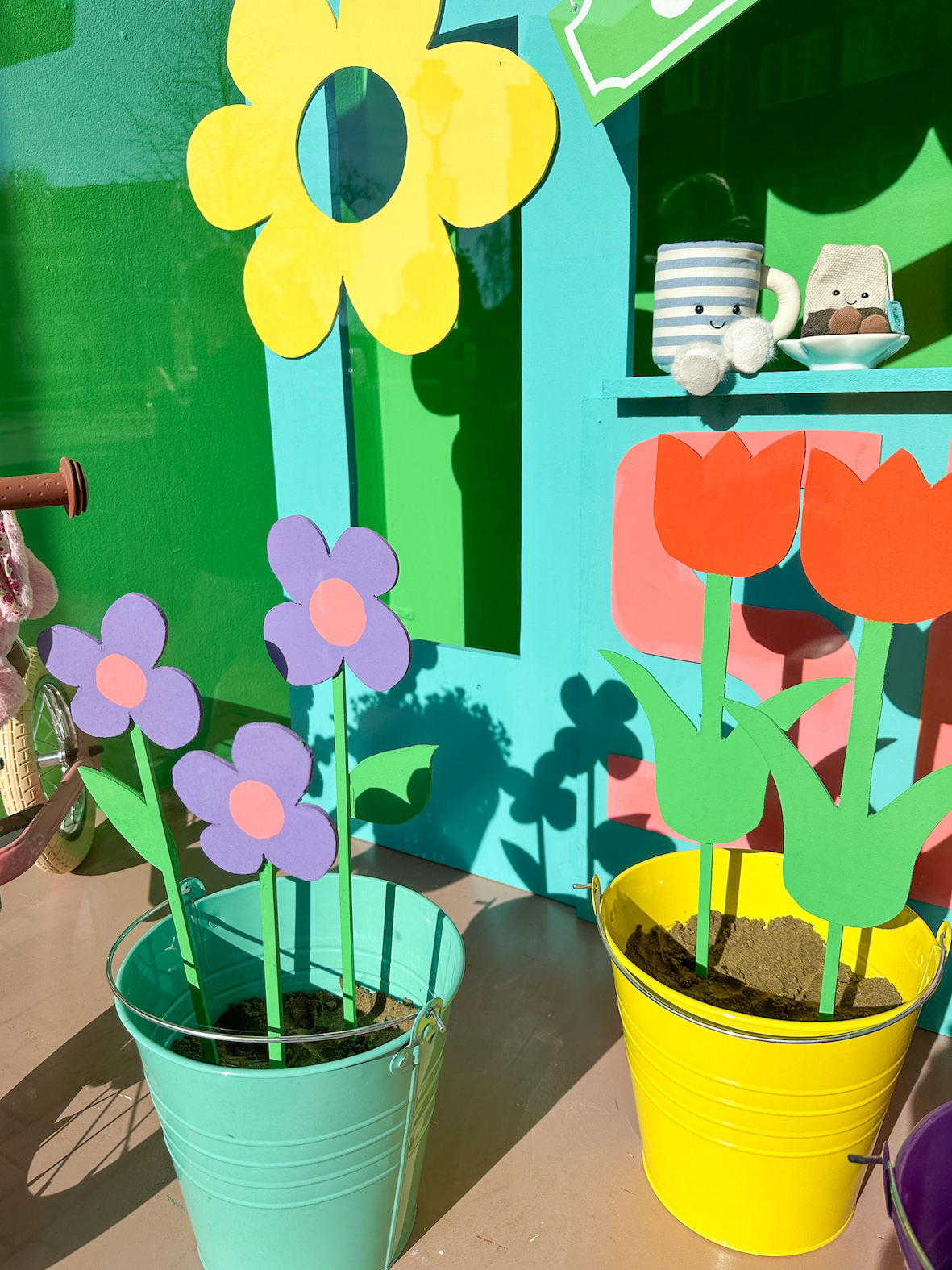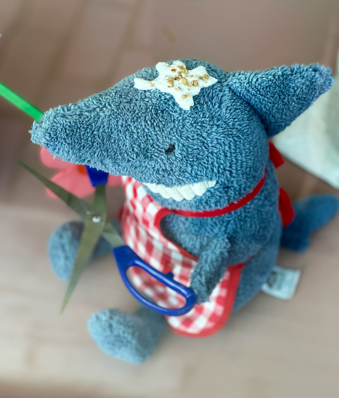 Maar vos heeft nog een hulpje… haai! Maar of ie daar nu zo blij mee is? Haai heeft de opdracht om de kamerplanten wat te snoeien want die planten hadden iets teveel van die heerlijke Pokon gegeten. Wij denken dat haai een brilletje nodig heeft want hij heeft de bloemen gesnoeid in plaats van de kamerplanten. De bloemen zijn zo kort geknipt dat ze helaas niet meer in een vaasje passen. Oefff… hoe lossen we dat nu weer op?