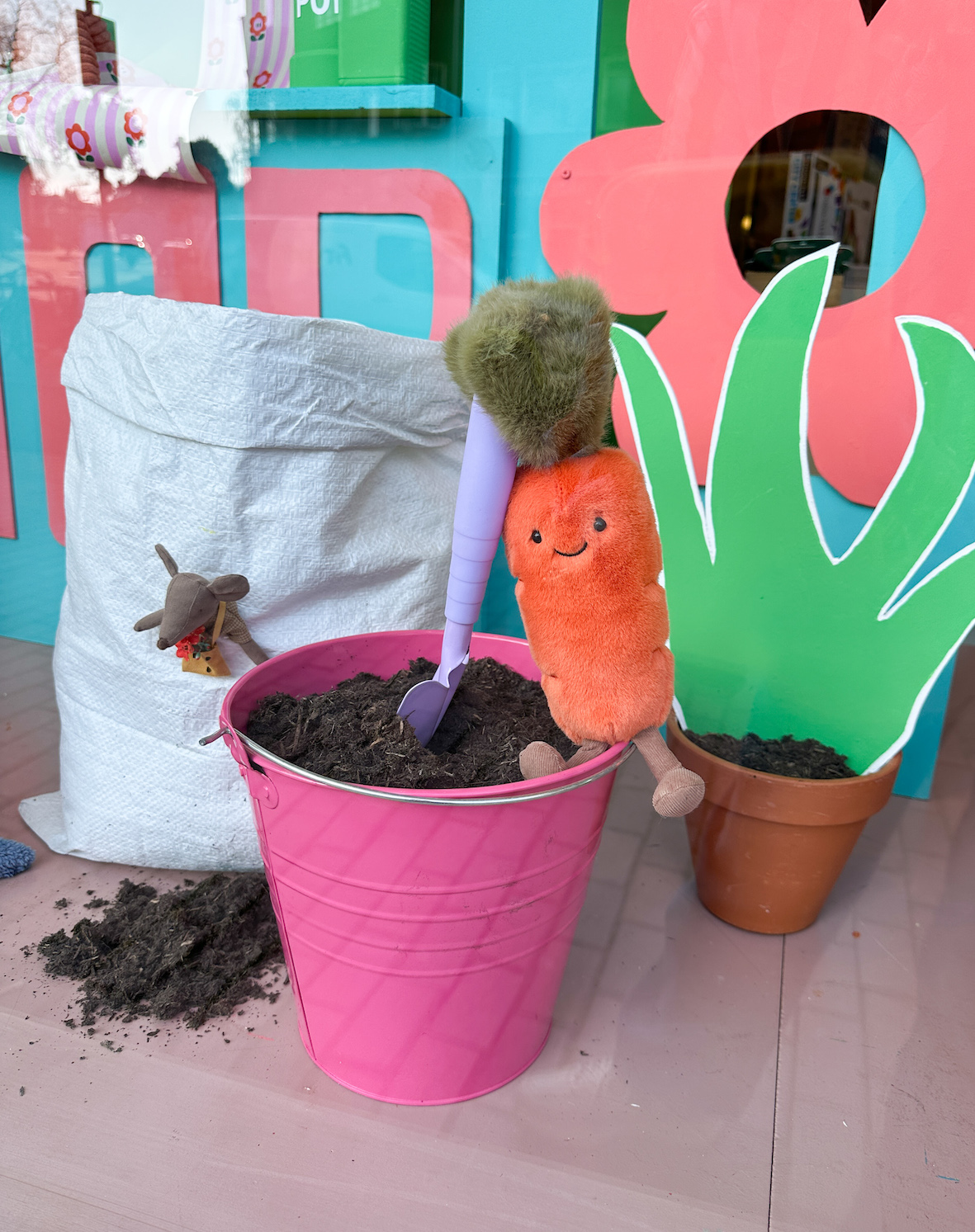 Vos heeft het druk met alle werkzaamheden die erbij komen kijken in een winkel. Gelukkig heeft hij een goed hulpje. Wortel is flink bezig de plantjes te verpotten want de Pokon heeft zijn best gedaan. Deze guitige medewerker past qua kleur ook zo lekker in de fleurige winkel. Helaas kampt de winkel met een muizenplaag… en prompt zien we daar een muisje. Die heeft zich verstopt in de zak met potgrond en een gaatje gemaakt waardoor er overal potgrond op de winkelvloer ligt. Maar okay… dat hoort een beetje bij een bloemenwinkel.