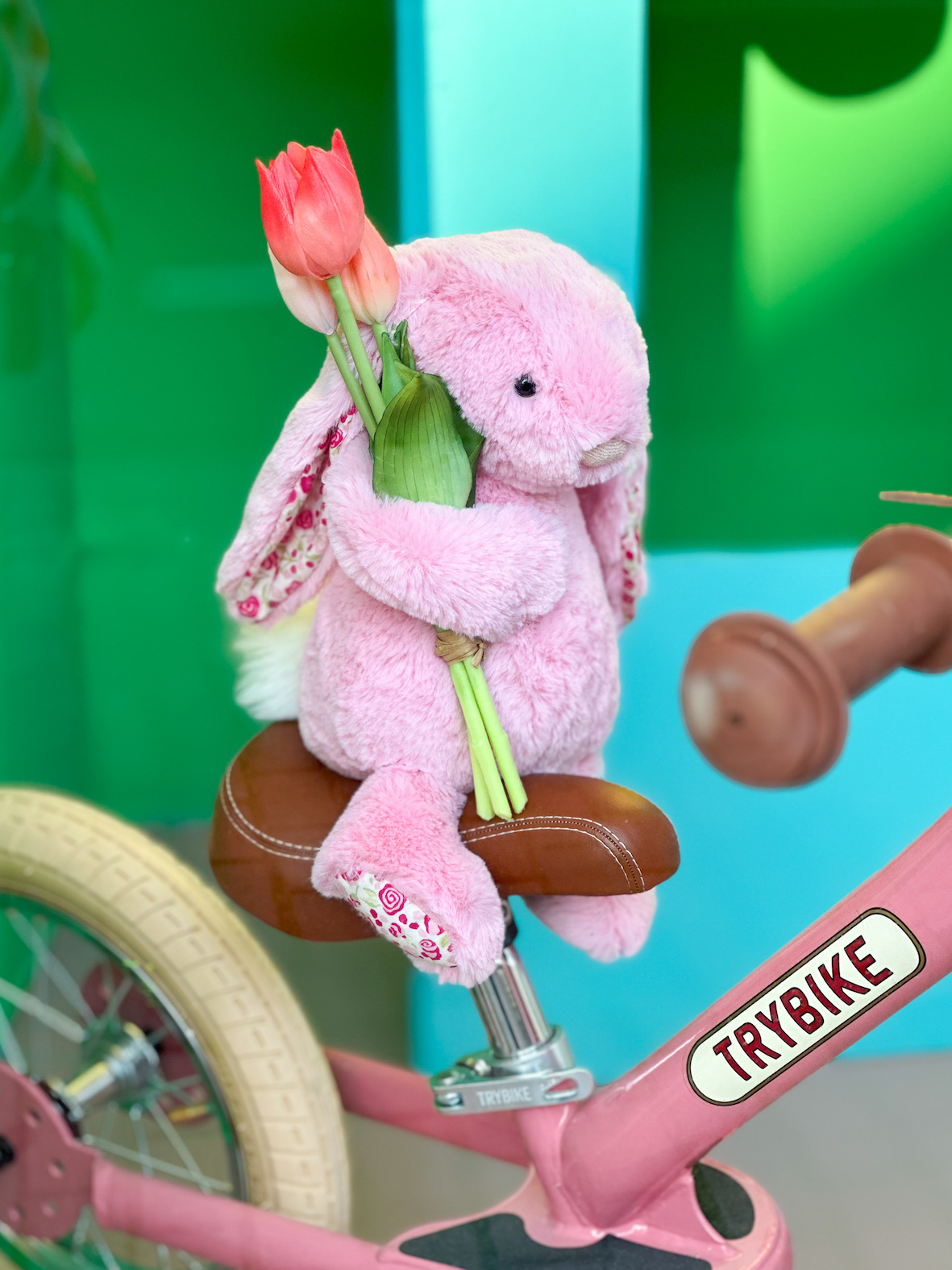Gelukkig heeft vos heel veel vaste klantjes die elke week een vers bosje bloemen komen halen. Zijn allerbeste klant is konijn. Konijn heeft de kleur van de zoetste bloementjes en heeft altijd wel een outfit aan met een bloemenprintje. Je kunt wel raden wat de lievelingskleur van konijn is. Ze komt elke week op haar roze Trybike aan en kiest elke week wel een bosje bloemen in de kleur roze. Vos vindt alles okay. Zolang konijn maar lekker bloementjes blijft kopen. De kassa moet immers rinkelen.